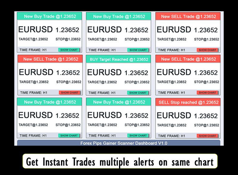 With the help of the Forex Pips Gainer Dashboard you will get the notifications for all the currencies you have selected. You can add minimum 4 trading assets to maximum 9 assets at the same time. Its mainly developed for expert traders who are looking for trading opportunity on different charts.