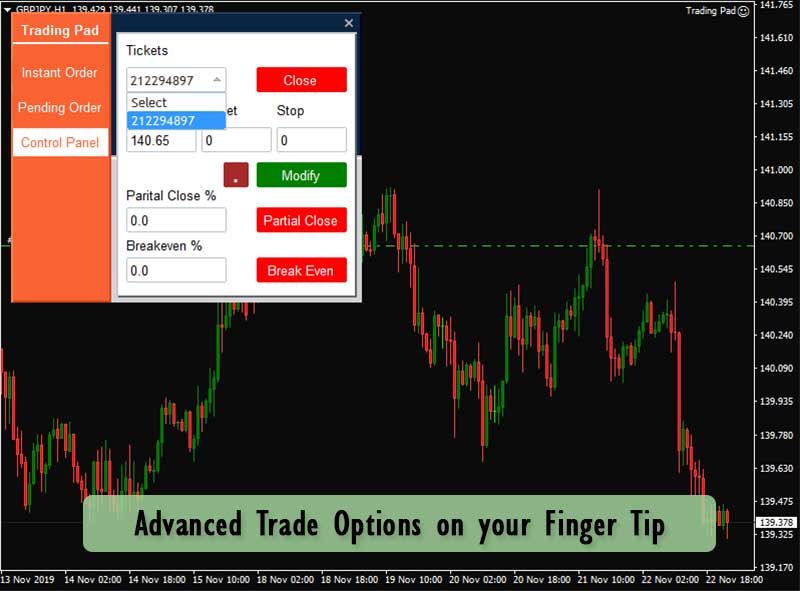 Quick trading Panel helps you place traders in single click most faster with 10x speed. It's one of the best handy tool which helps you place Instant orders, Pending orders, Edit & Close your orders more effective Manager. A trader can easily place orders by placing lines into the chart. It will automatically get the Entry, Target & Stop Prices.